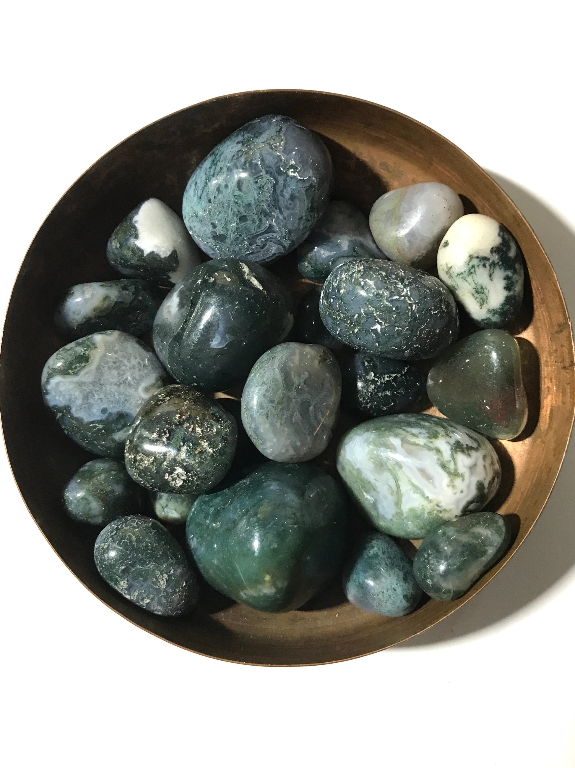 Moss Agate has always been celebrated as a lucky talisman. When placed among flowers they seem to bloom brighter, when kept in a place of work or your desk, business seems to boom, and when carried with you in your pocket, the streams of abundance seem to flow towards you.